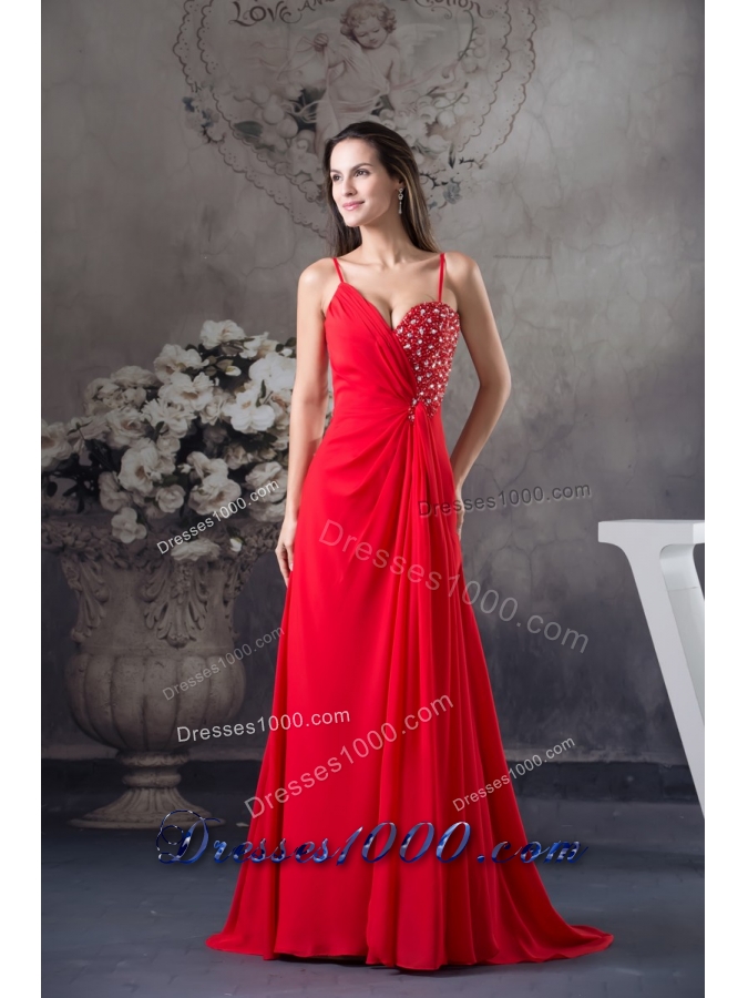 Column Sweep Train Red Prom Dress with Beading for Party