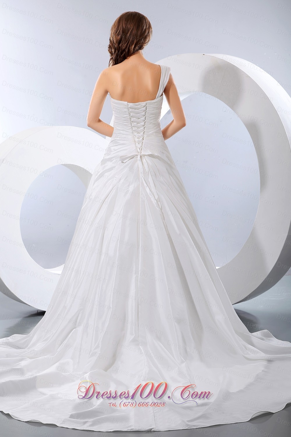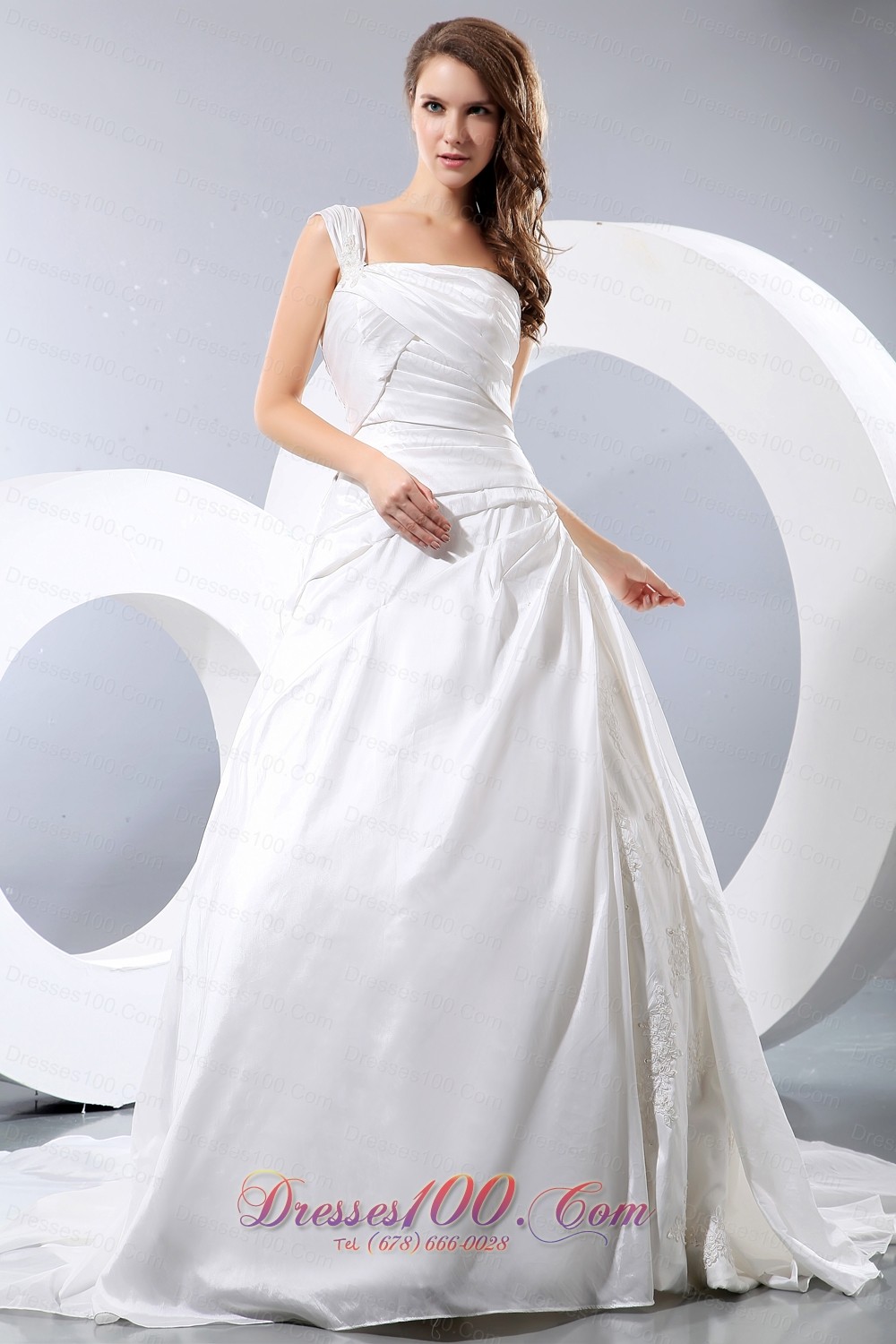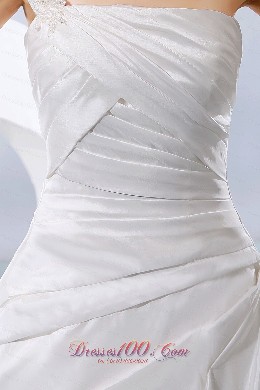 One Shoulder Appliques Chapel Train Ruch Wedding Dress