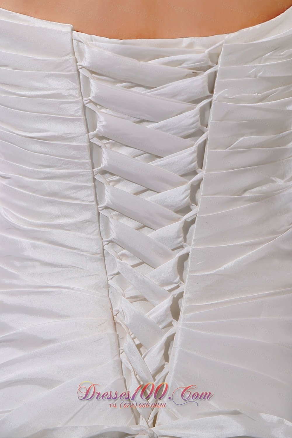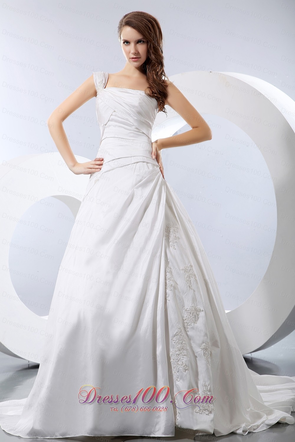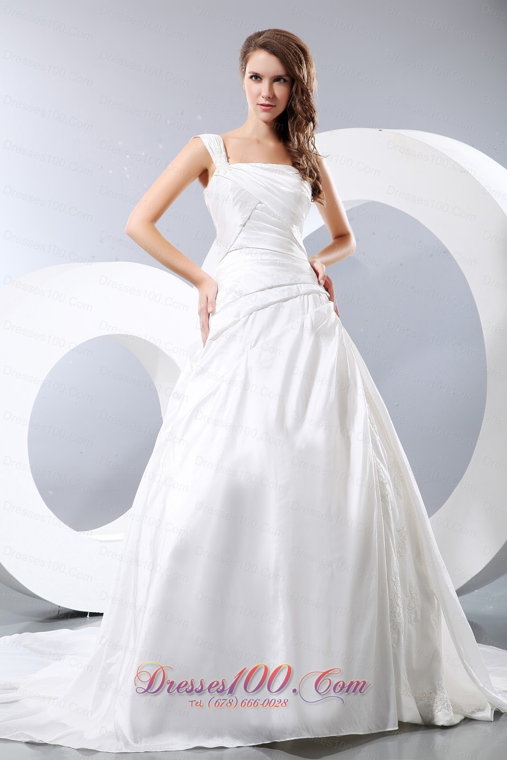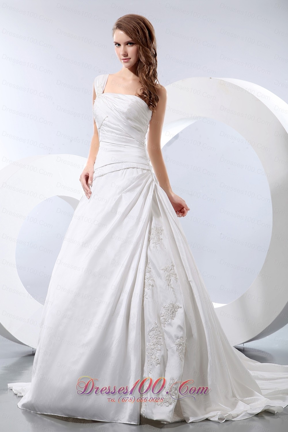 One Shoulder Appliques Chapel Train Ruch Wedding Dress