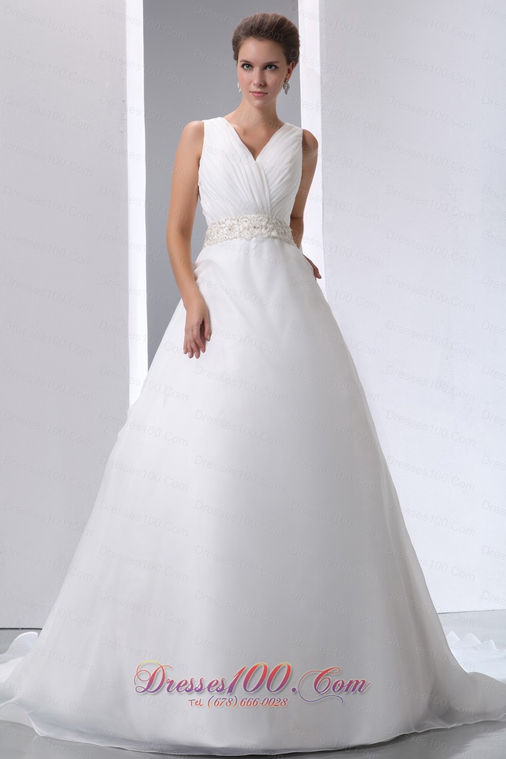V Neck Beading Ruched Court Wedding Bridal Dresses