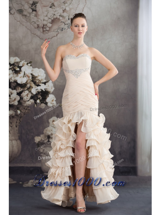 Champagne High Slit Prom Holiday Dress with Beading and Ruffled Layers