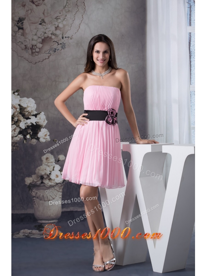 This feminine strapless dress is just perfect for any formal function. Crafted from classic chiffon it features a pleated bust line and a taffeta sash with several delicate hand made flowers on the front of the waist. The lightweight skirt falls in soft pleats and folds above your knees and twirls and sways when you move. Although pictured in a baby pink color, this dress is available in several other color choices.