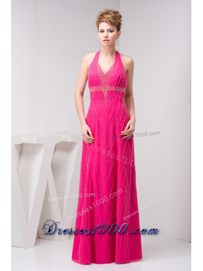 Column Hot Pink Halter Top Beaded Prom Dress with the Back Out