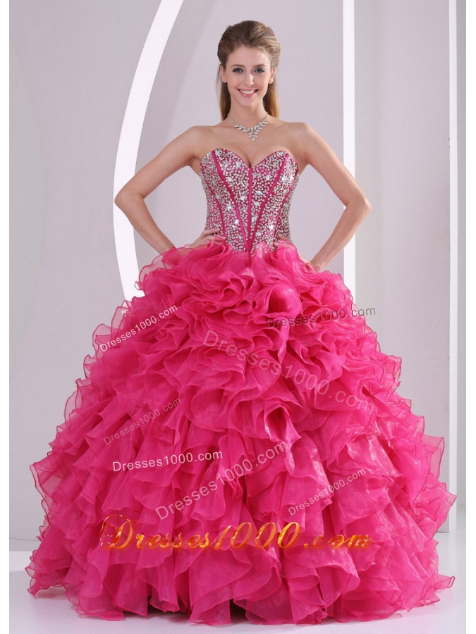 Hot Pink Ball Gown Sweetheart Ruffles and Beading Long Organza Quinceanera Gowns