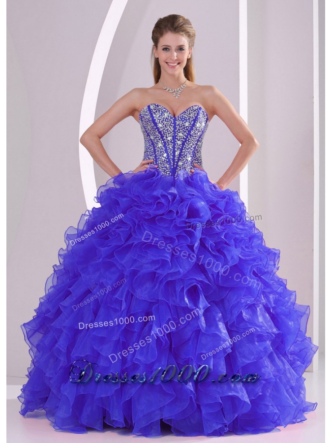 Blue Sweetheart Ruffles and Beaded Decorate Organza Quinceanera Gowns