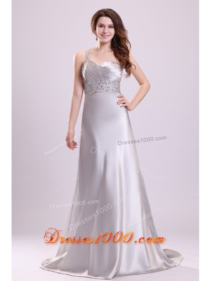 Sexy Column One Shoulder Brush Train Grey Beaded Prom Gown