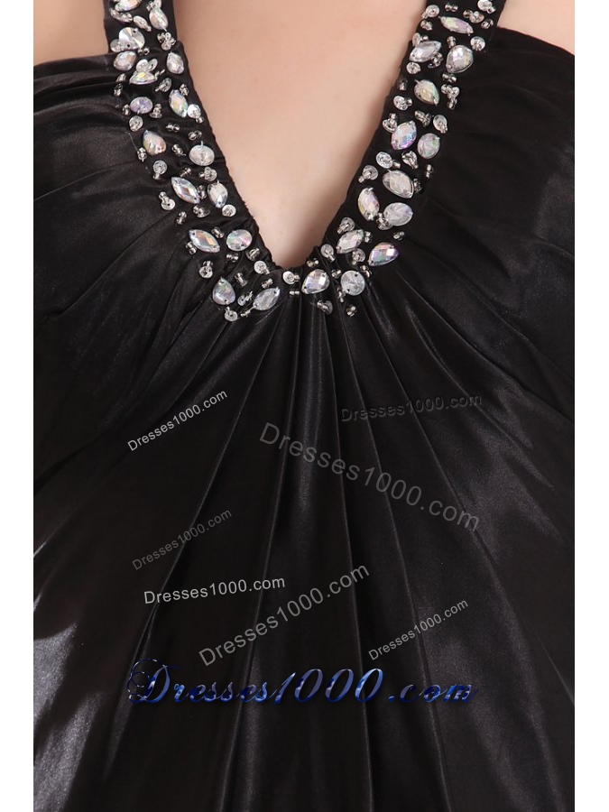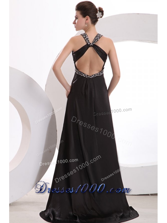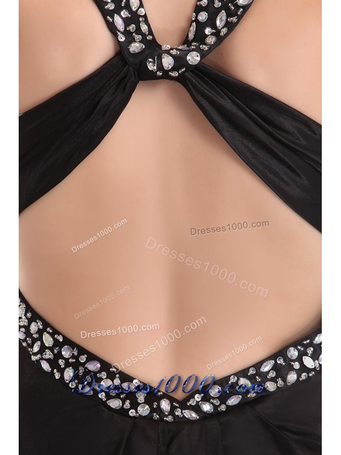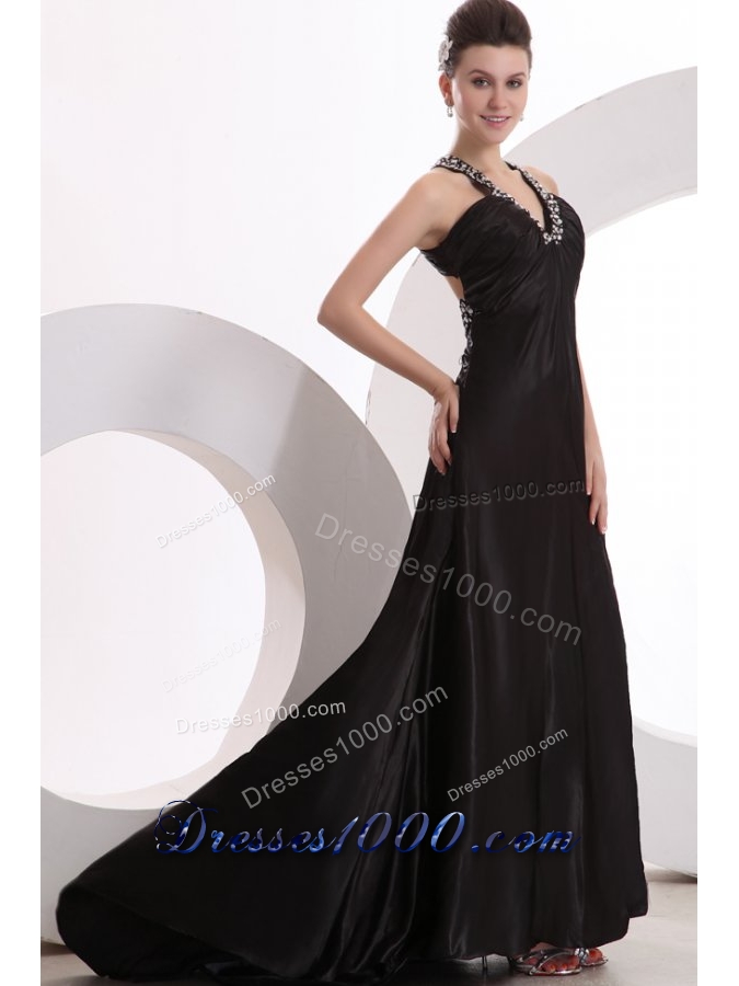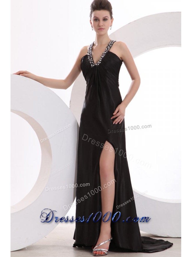 Black V-neck Beaded High Silt Prom Gown Dress with Brush Train