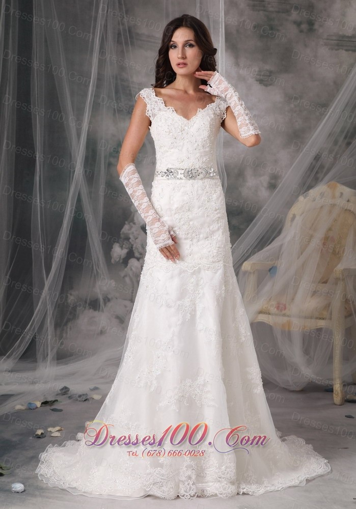 If you're looking for a chic and elegant dress for your wedding, this one would make a great choice. A sheer overlay embellishes the A-line skirt with elegant embroidery. The floor-length hemline finishes with scalloped edging. The bodice features cap sleeves and a lovely V neckline and also a open back under the V-shape lace. Oh, so classy!