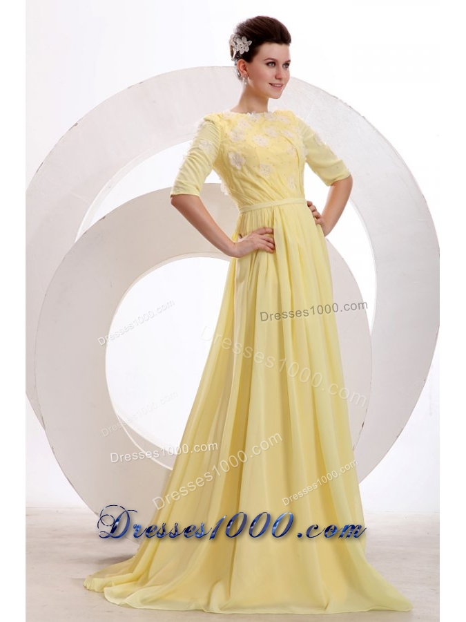 Bateau Neck Half Sleeves Yellow Brush Train JS Prom Dresses