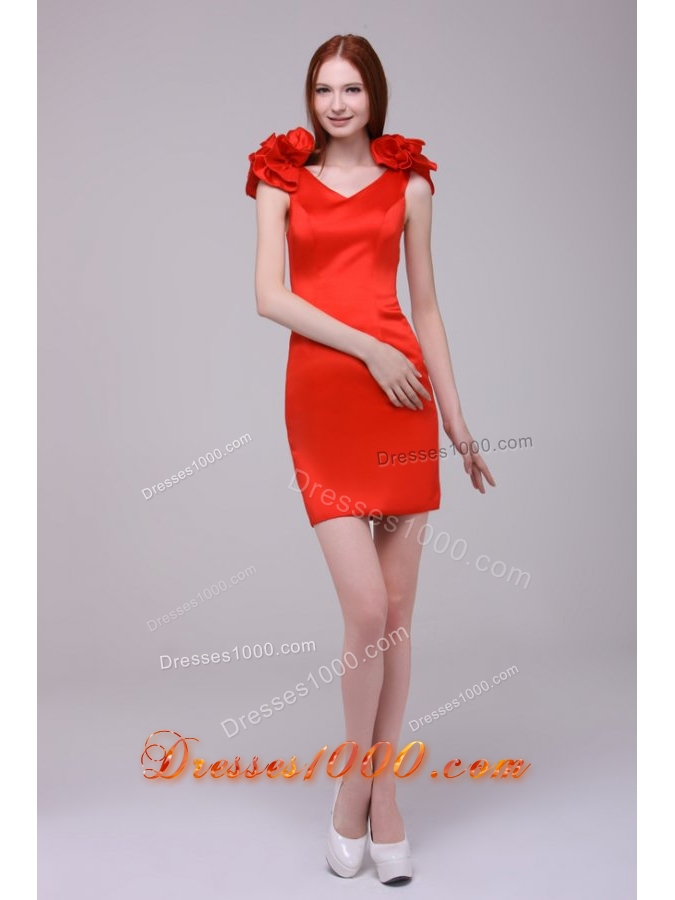 Cute Red Short Sheath V-neck Prom Gown with Handle Flowers