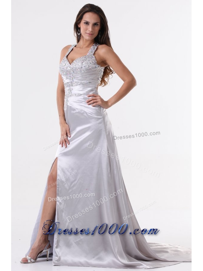 Beaded Wide Straps High Slit Sweep Train Prom Gown Dresses