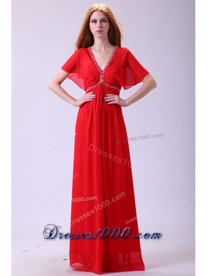 Fan Sleeves V-neck Red Chiffon Prom Celebrity Dress with Beading