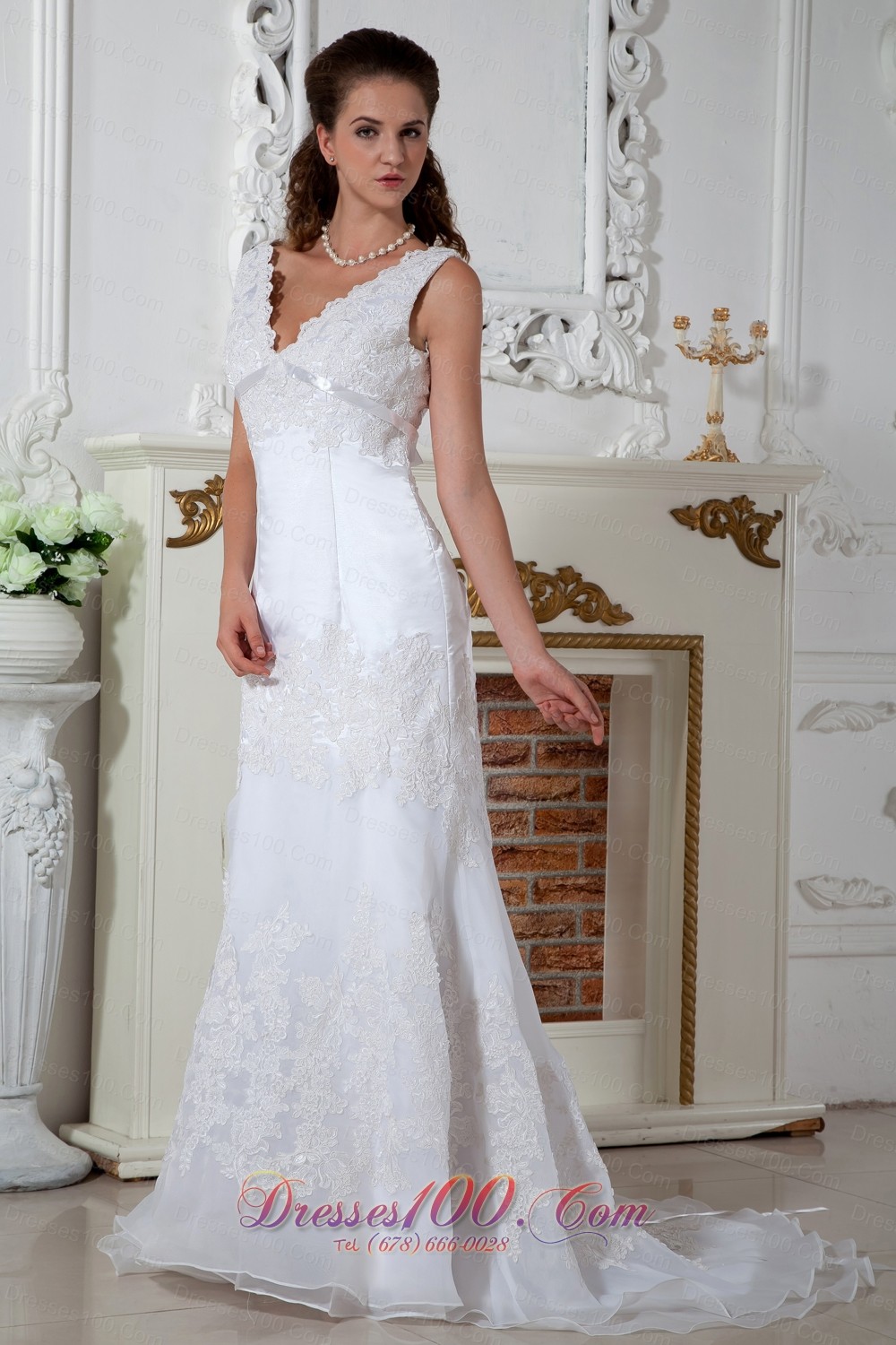 Lace V Neck Appliques Column Court Wedding Dress