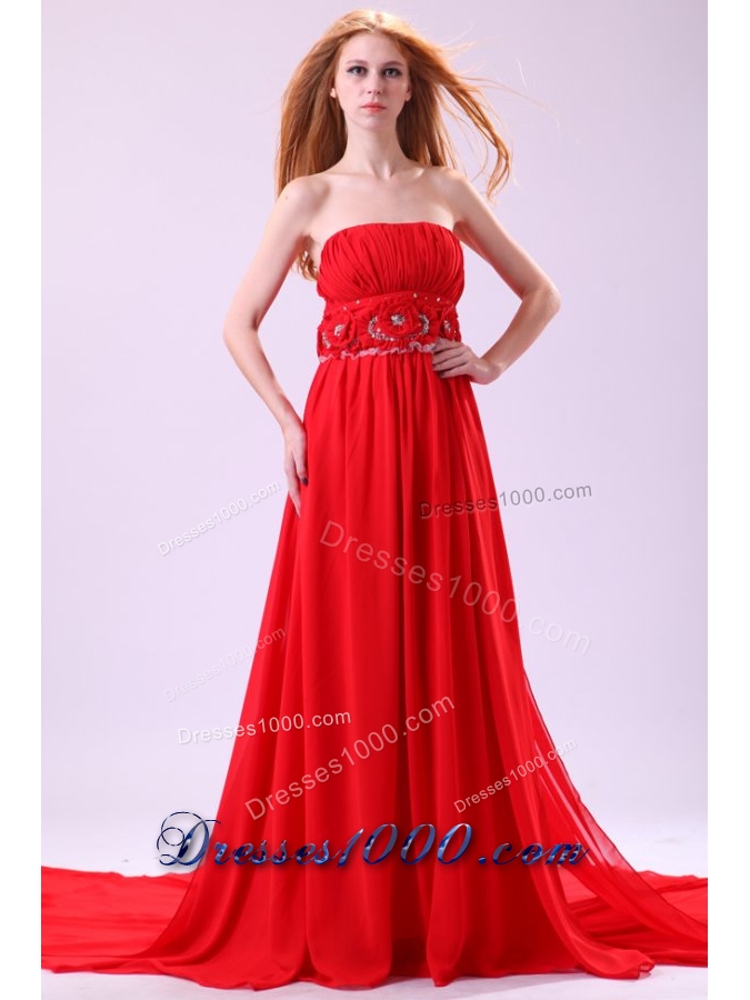 Beaded Handle Flowers Decorated Empire Red Chiffon Prom Dress