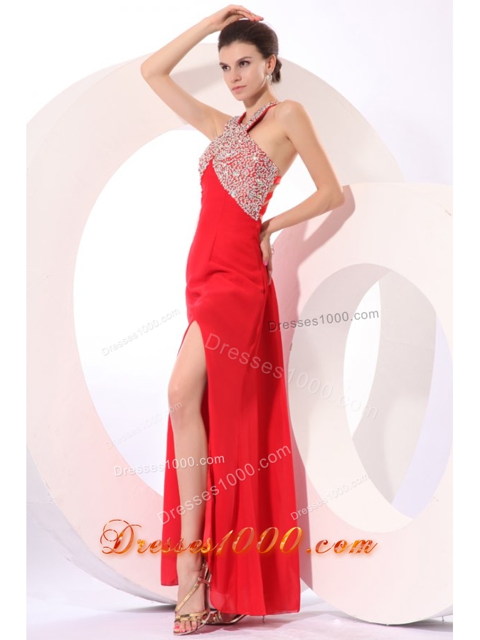Paillettes Decorated High Slit Red Taffeta Prom Dress for Women
