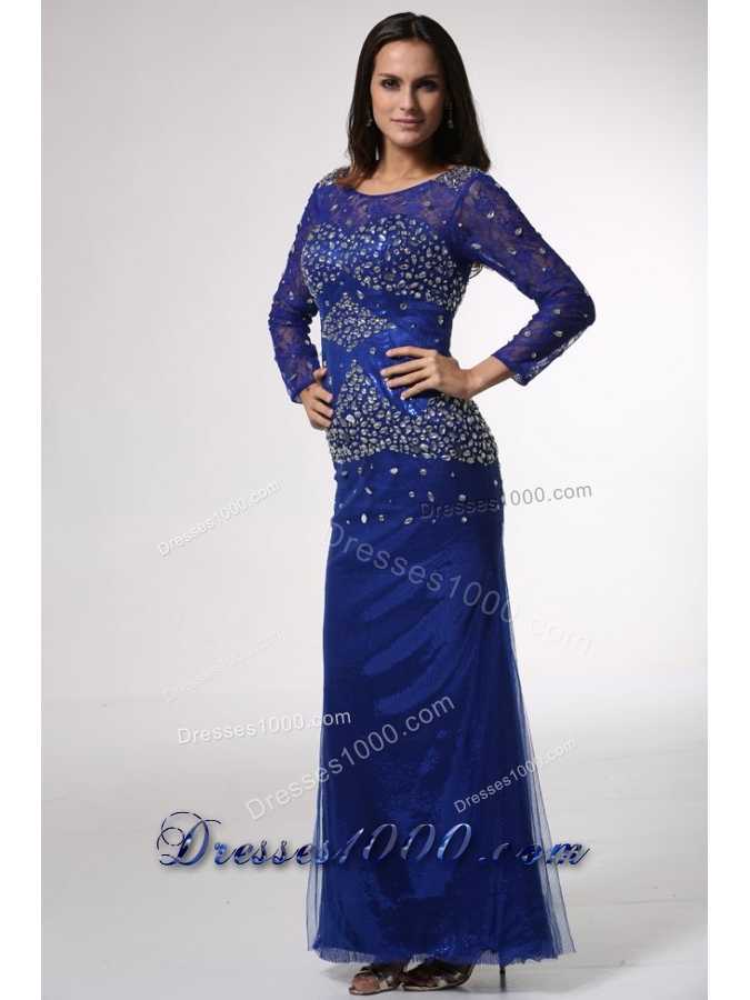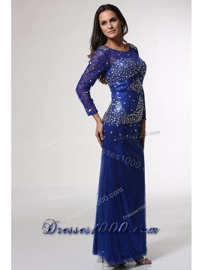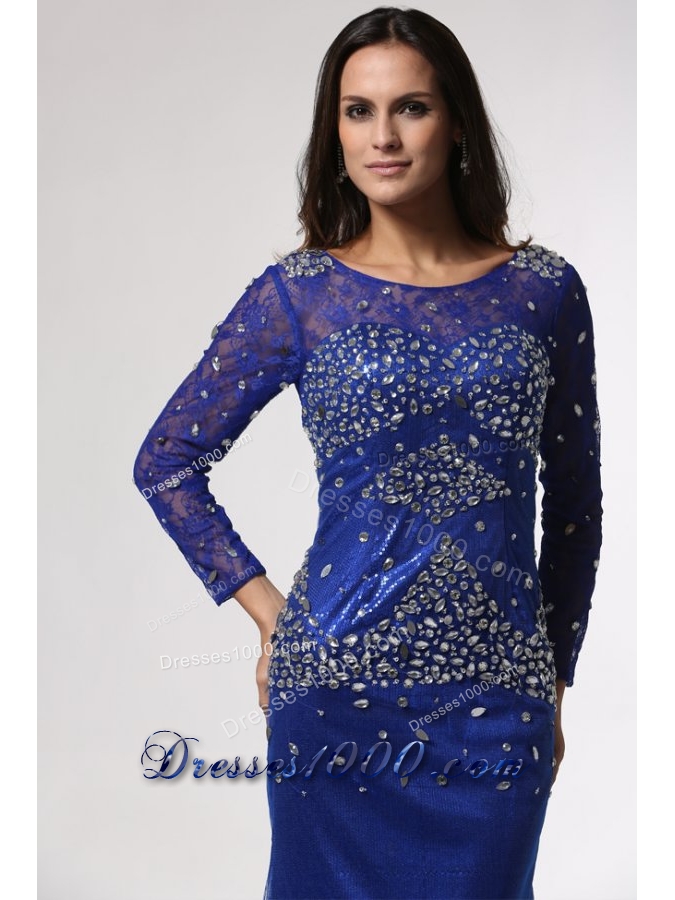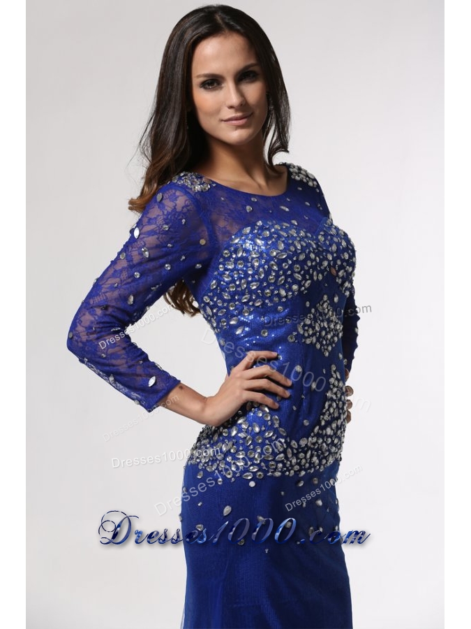 Noble Blue Scoop Long Sleeves Column Prom Dress with Beading
