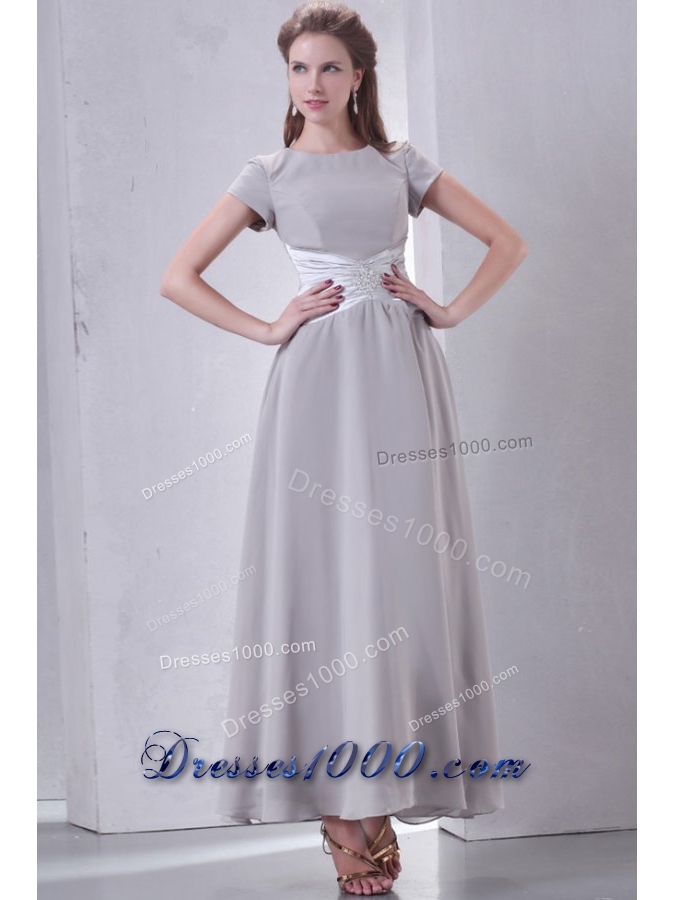 Short Sleeves Scoop Ankle-length Gray Chiffon Prom Gown Dress