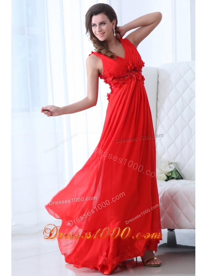 V-neck A-line Handle Flowers Red Chiffon Prom Gown for Woman