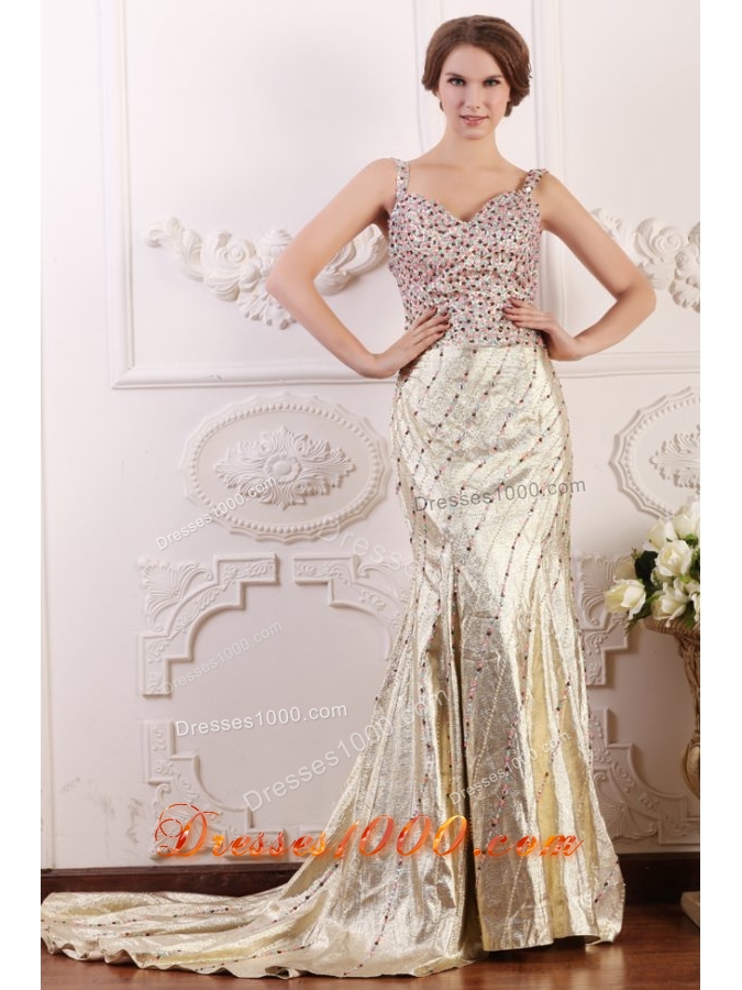 Diamonds Decorated Straps Trumpet Court Train Prom Dresses
