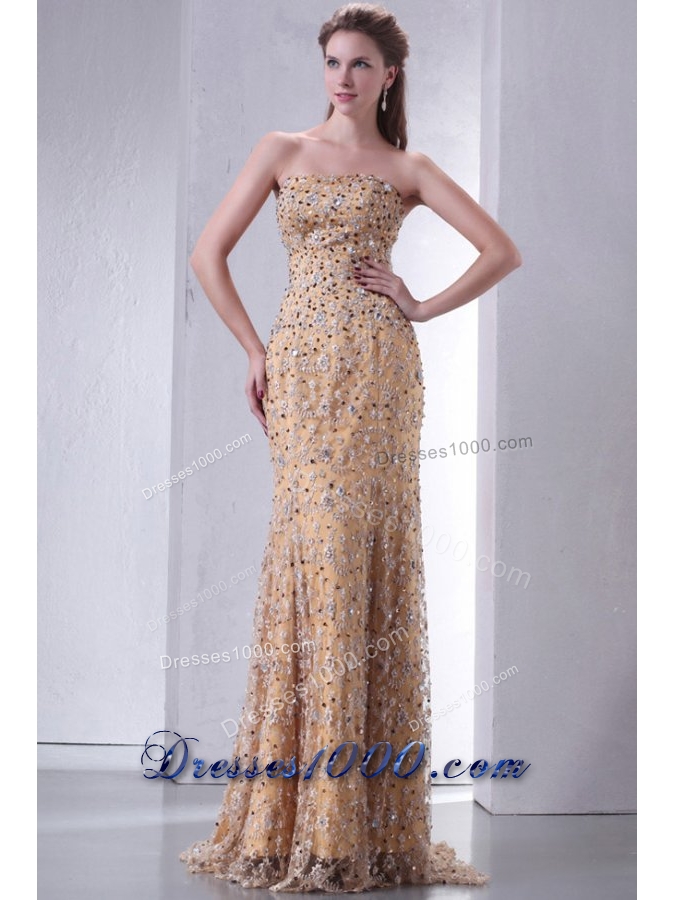 Paillettes Decorated Lace Column Strapless Prom Pageant Dresses