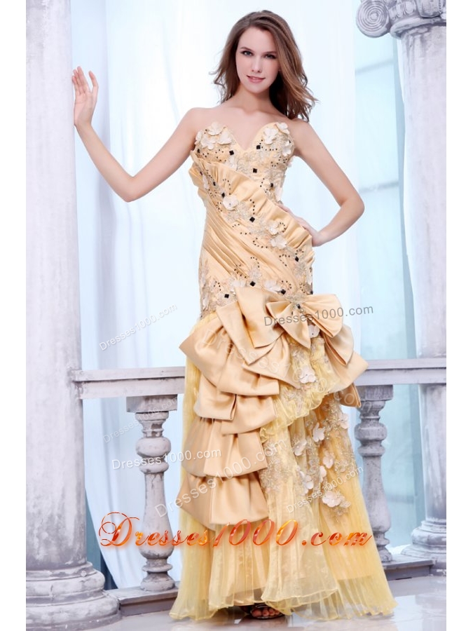 Bowknot Unique Sweetheart Beading and Flowers Gold Prom Dresses