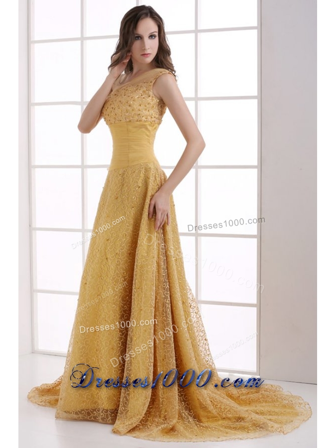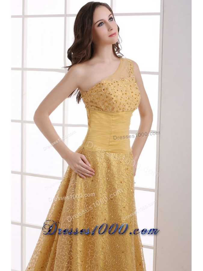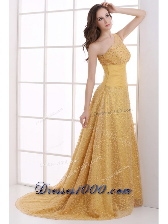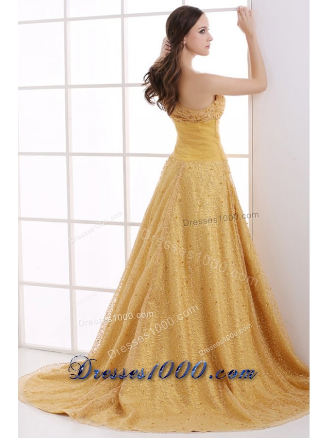 Lace One Shoulder Ruching Court Train Gold Dresses for Prom