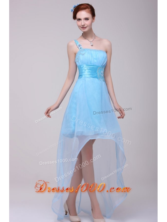 Single Shoulder High Low Ruching Organza Prom Gown in Aqua Blue