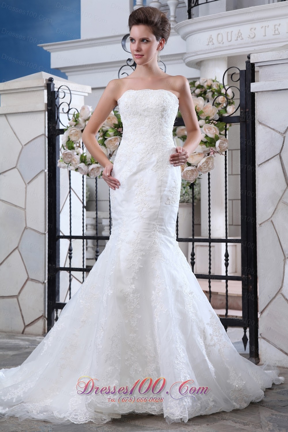 Your wedding gown should reflect your style and taste, this dress must just be the one you are looking for. Both vintage and eyecatching. The bodice is encrusted with a favorable strapless neckline which will never be out of date. Class mermaid style with appliqued tulle gives a romantic look.Hidden zipper up back with fastener design adds interests and make the dress easy on and off.The chapel train moves beautiful when you walk. What a perfect look!