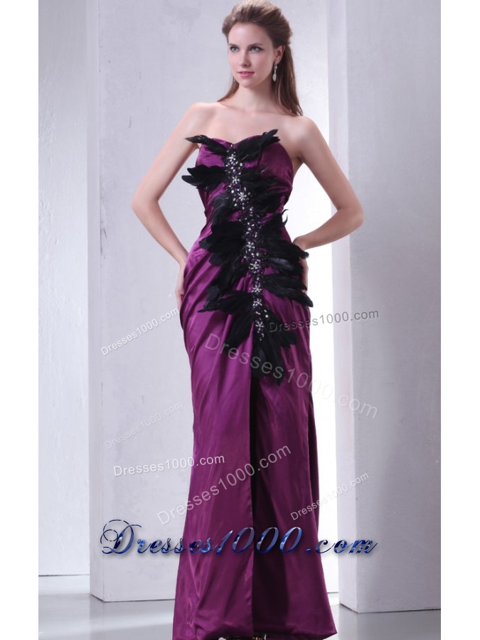 Beading and Feathers Sheath Sweetheart Purple Taffeta Prom Dresses