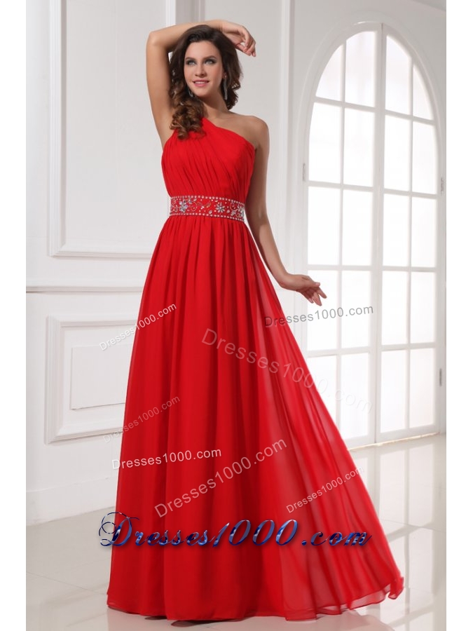 Single Shoulder Red Chiffon Prom Gown Dress with Beaded Waist