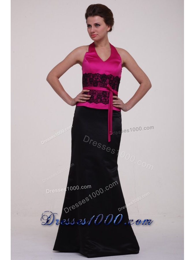 Graceful Hot Pink and Black Satin Halter Top Prom Dress