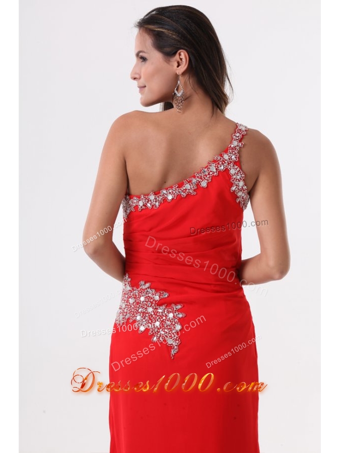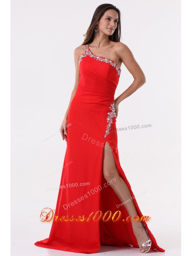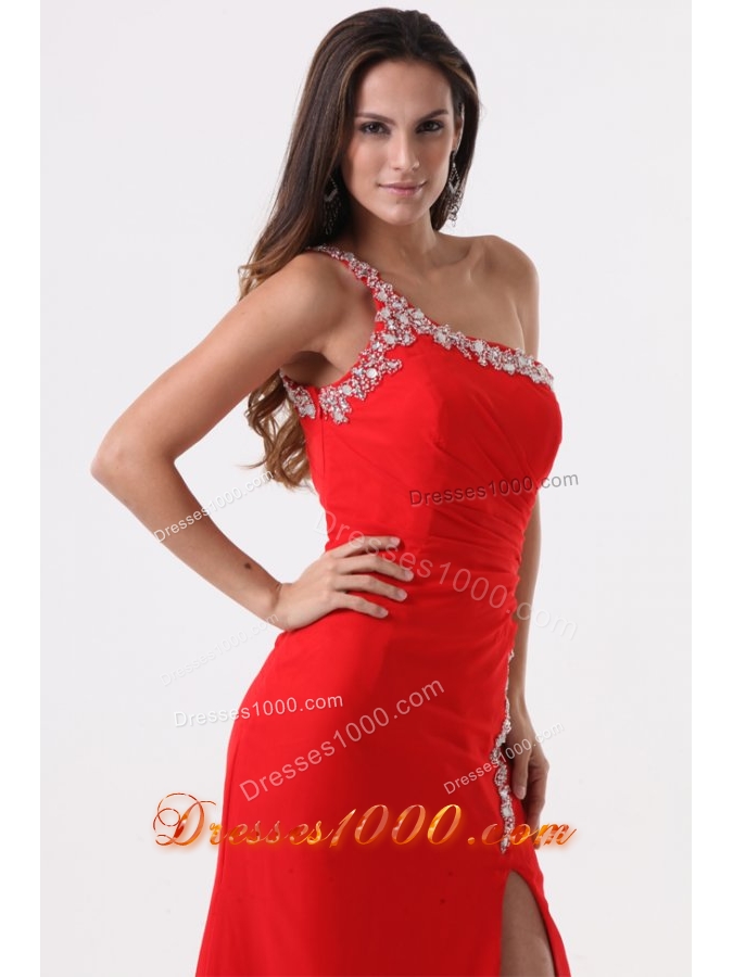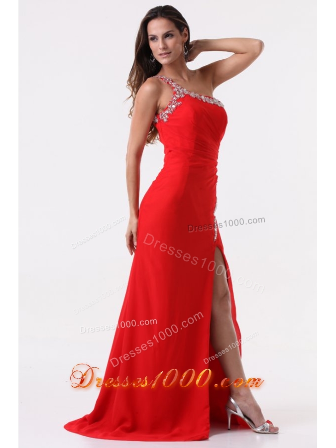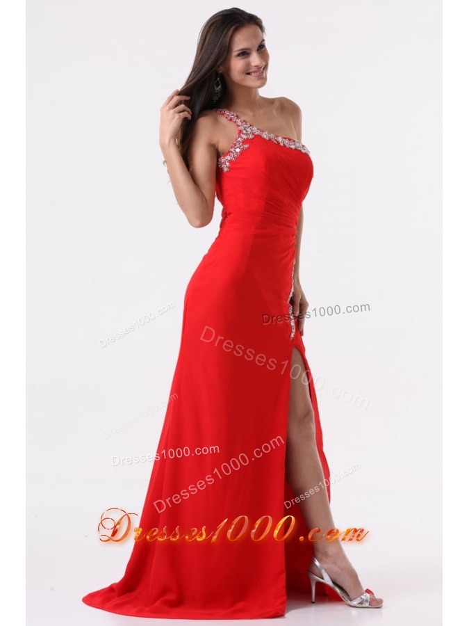 Sexy Red One Shoulder Beading High Slit Prom Dress