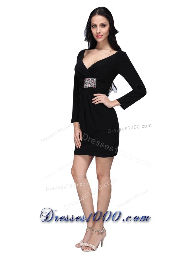 Black Mini-length Beaded Decorate Prom Dress with Long Sleeves