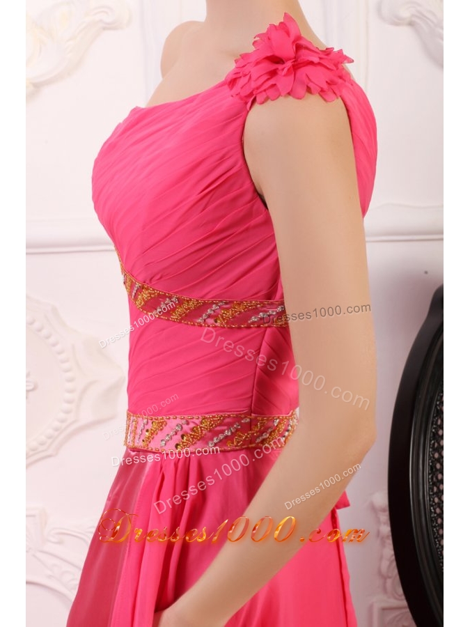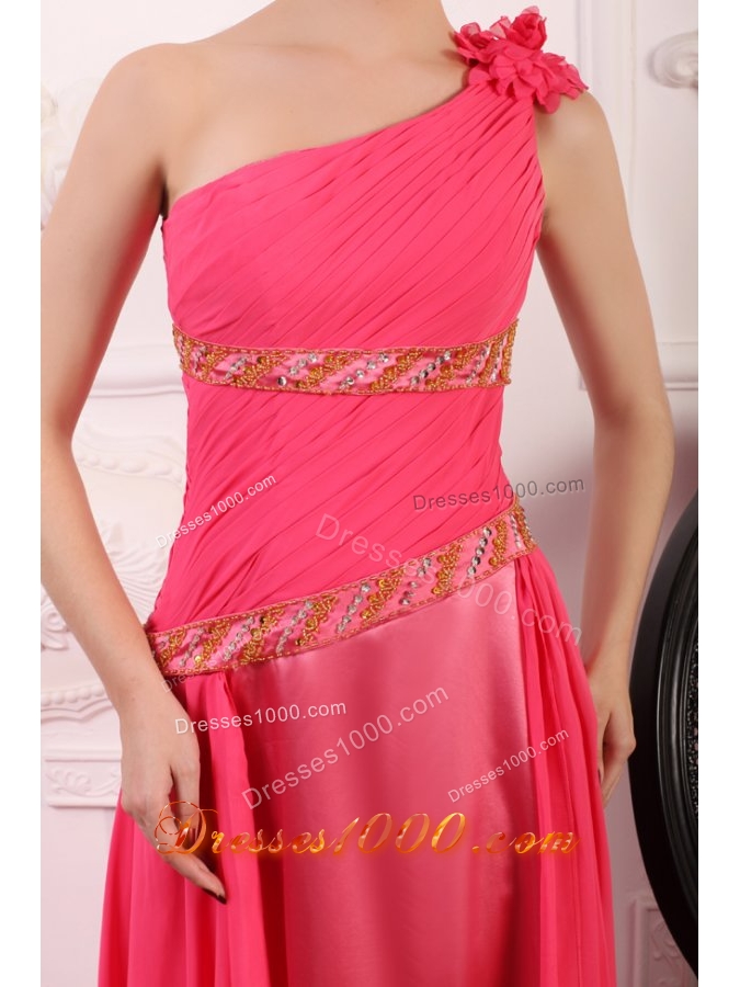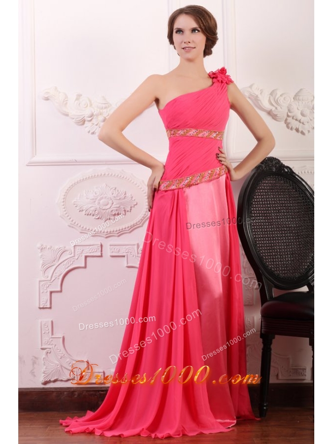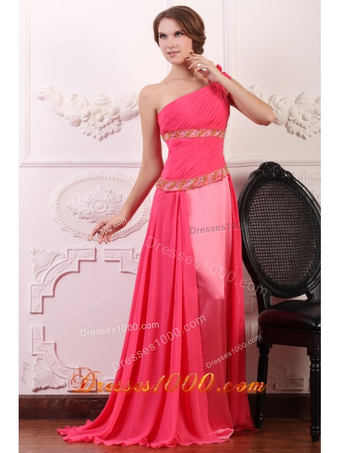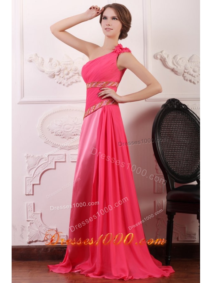 Empire One Shoulder Flowers Beaded Prom Dresses with Brush Train
