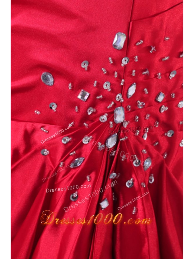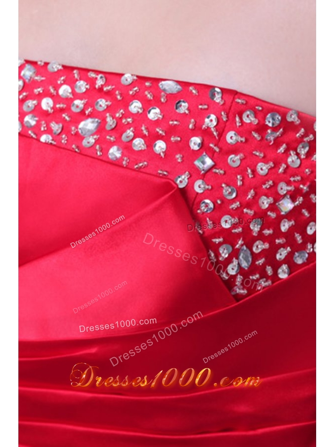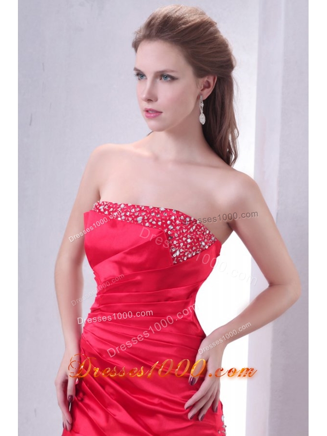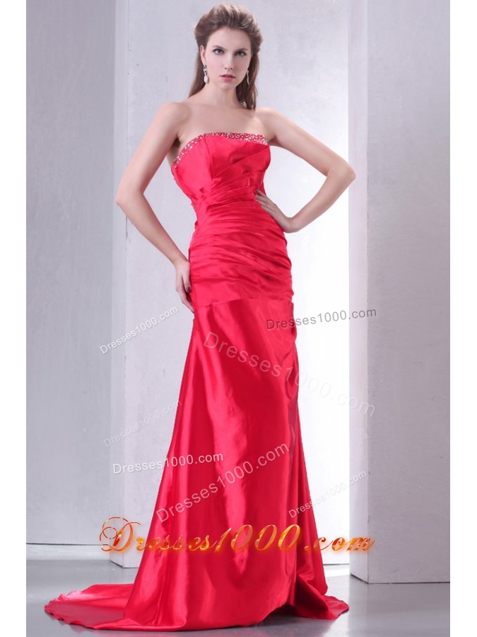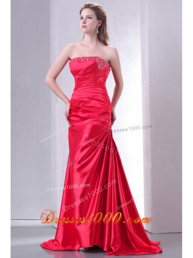 Strapless Coral Red Sweep Train Beaded Prom Gowns with Train