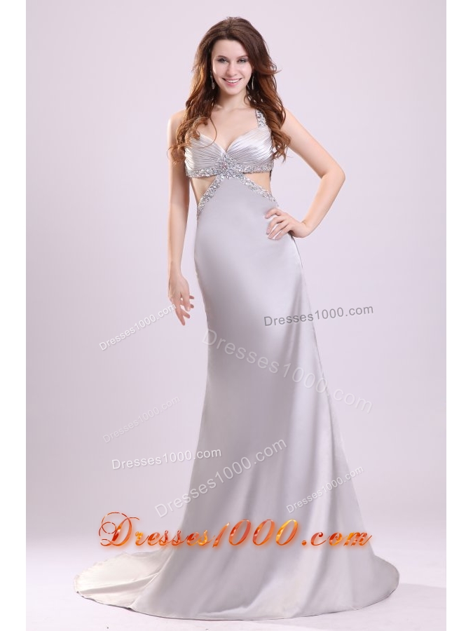 Column Straps Beading Satin Brush Train Gray Prom Dress Open Back