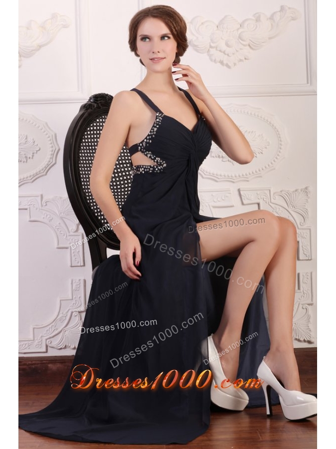 Straps Empire Chiffon Beading Sweep Train Prom Formal Dress in Black