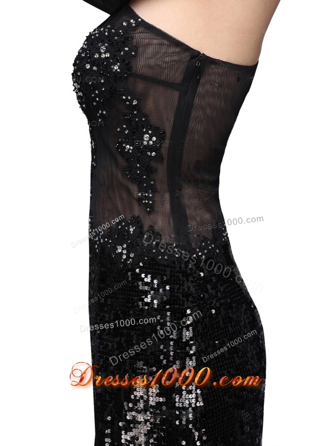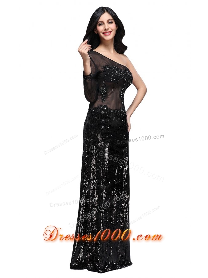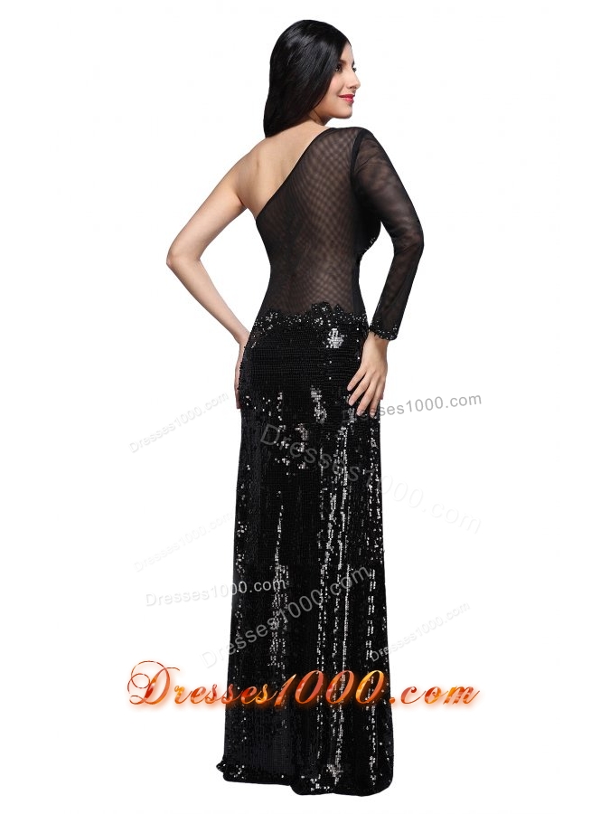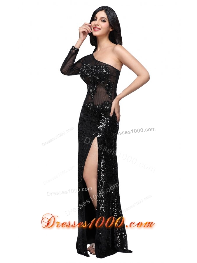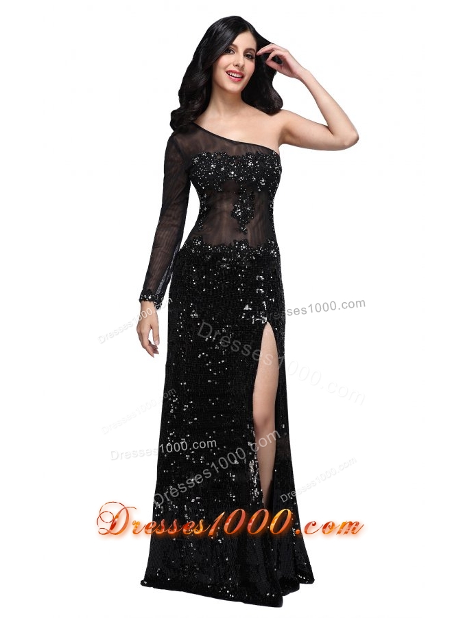 Column Black One Shoulder Long Sleeve Sequins High Slit Prom Dress