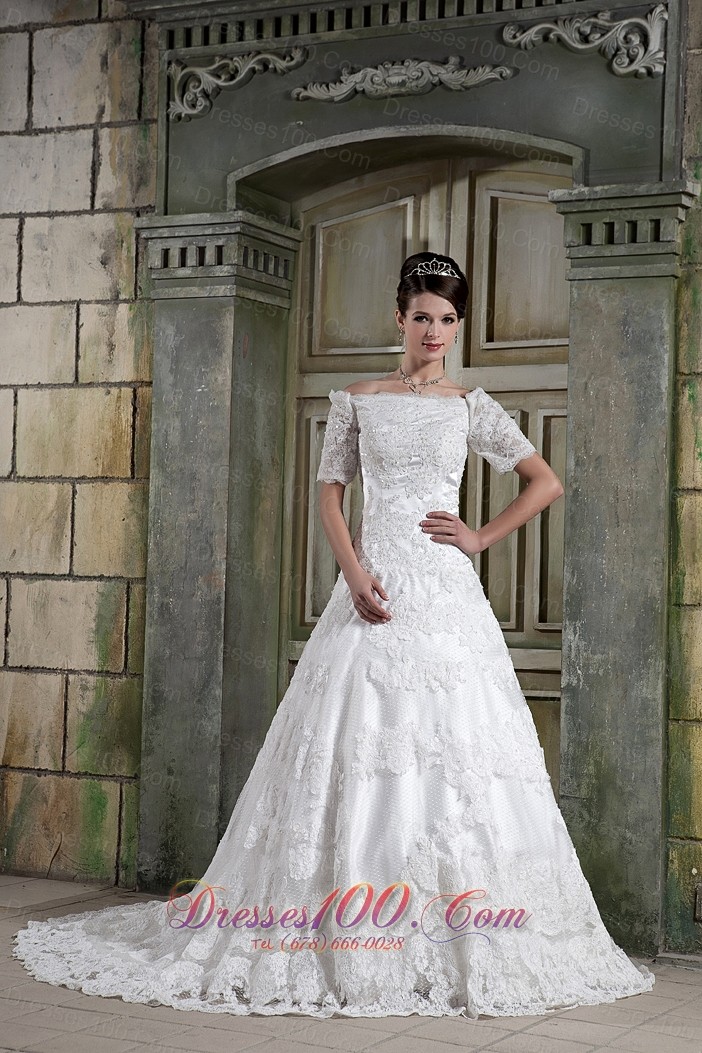Lace Off The Shoulder Chapel Wedding Bridal Dress