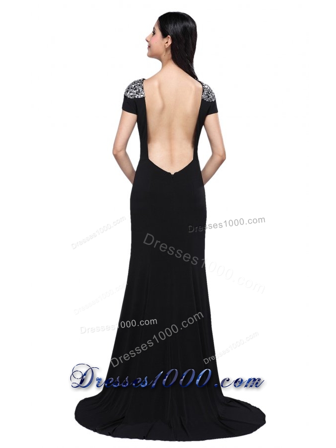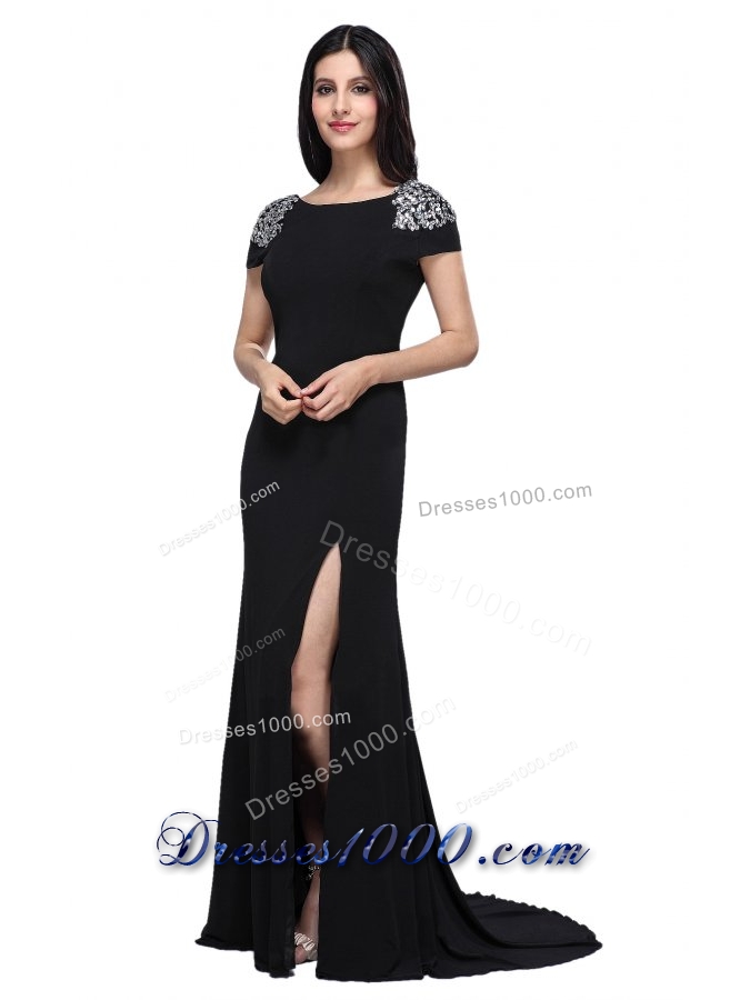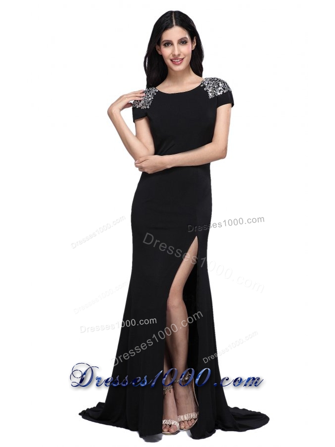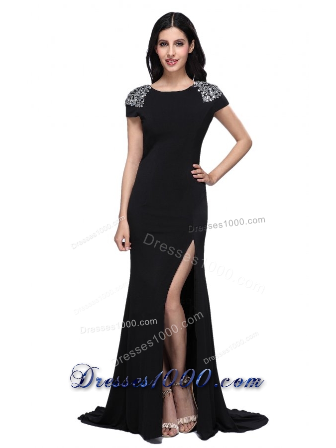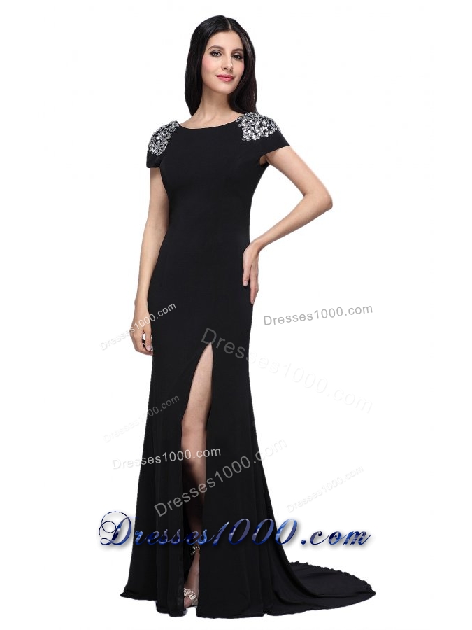 Black Scoop Cap Sleeves High Slit Brush Train Beading Prom Dresses