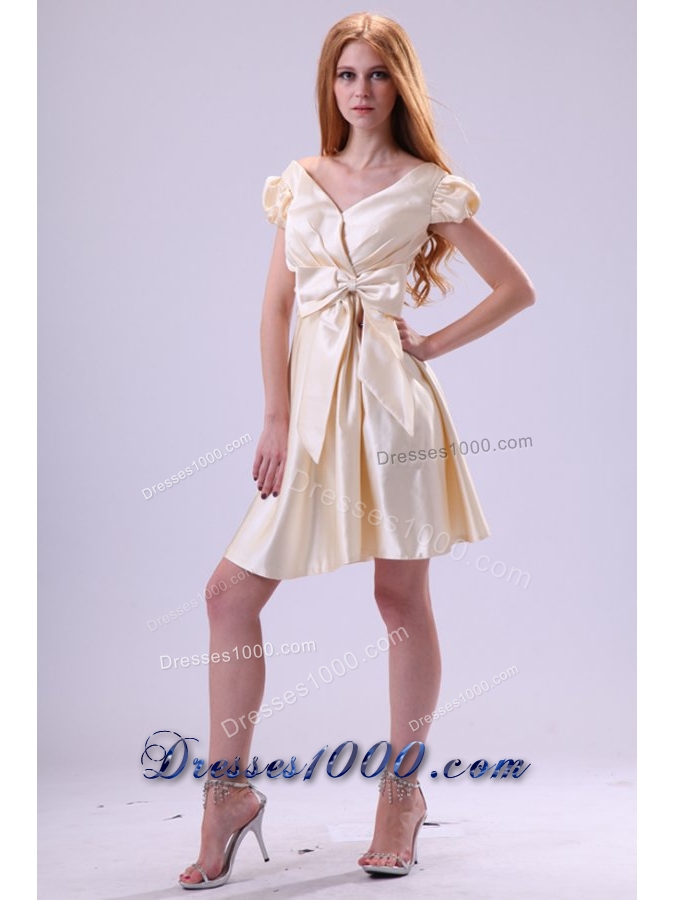 Light Yellow V-neck Cap Sleeves Bow Ruching Prom Homecoming Dress