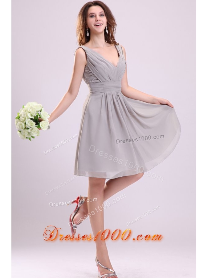 Chiffon Knee-length Empire Gray V-neck Ruching Prom Pageant Dress