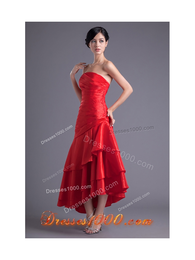 Asymmetrical Red Strapless Dance Dress with Ruches and Layers
