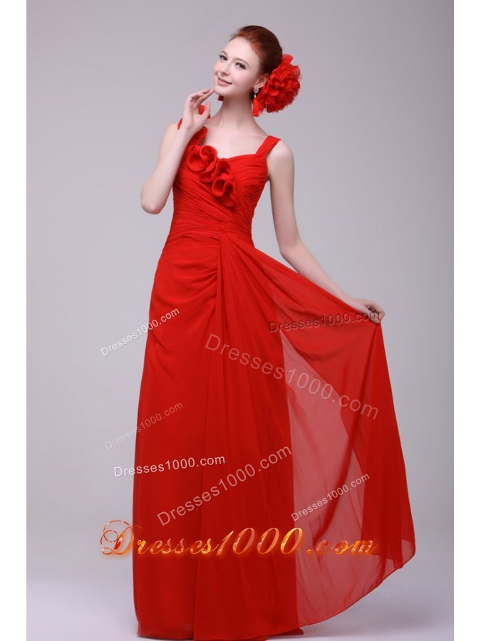 Floral Red Chiffon Prom Dress with Ruches and Straps