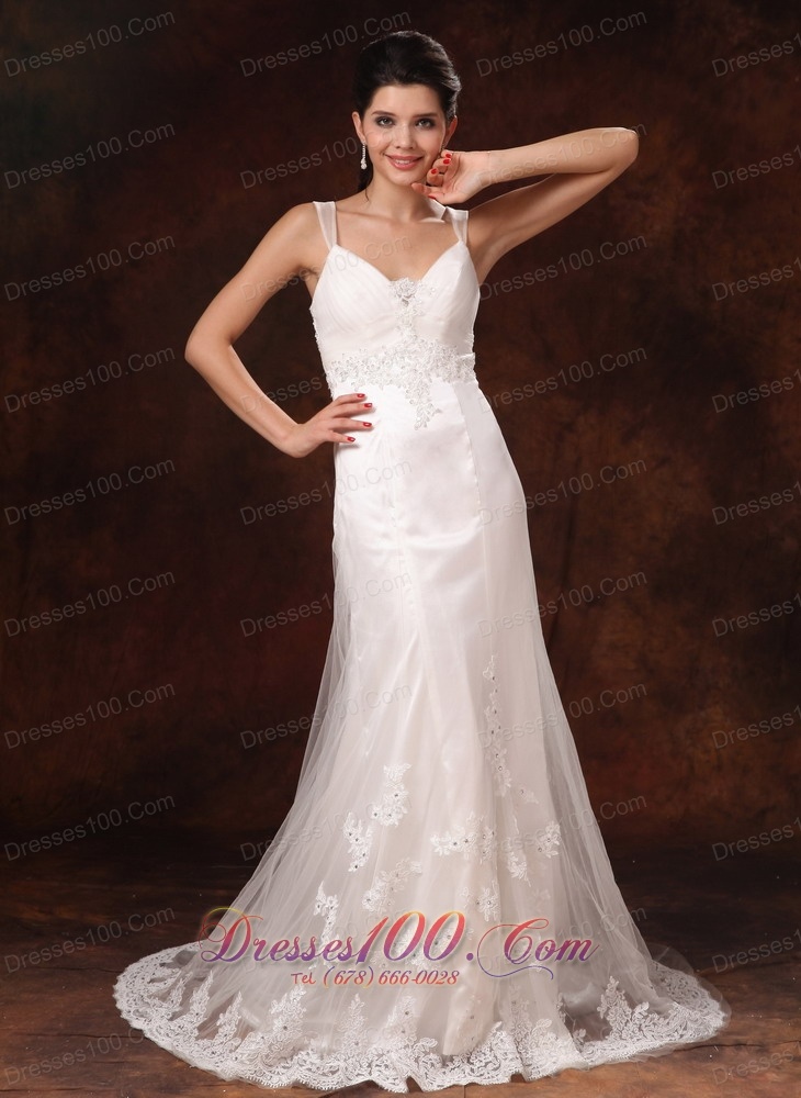 Straps V-neck Lace Wedding Dress Trumpet Brush Train