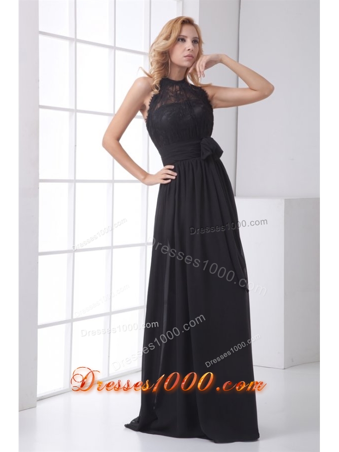 Simple Empire Halter Black Lace Chiffon Floor-length Prom Dress