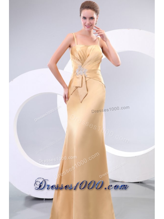 Column Champagne Spaghetti Straps Prom Dress with Ruching Appliques