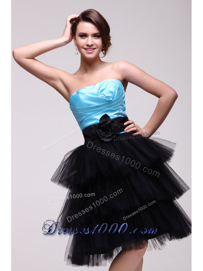 Blue and Black Strapless Senior Prom Dress with Ruches and Layers