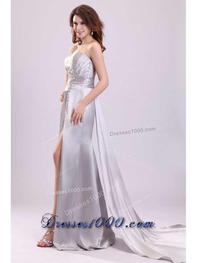 Watteau Train Silver Evening Dress with Ruches and Slit
