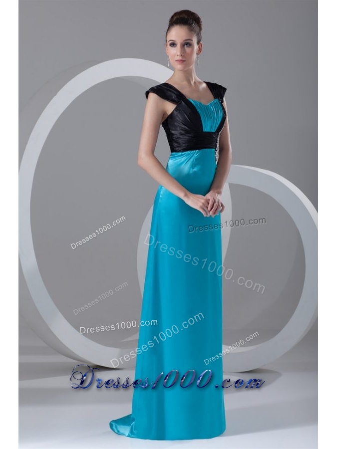 Black and Blue Elastic Woven Satin Prom Dress with Cap Sleeves
